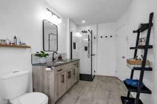 - Renovated bathroom (2022): freestanding tub, glass shower with stone floor, large quartz countertop